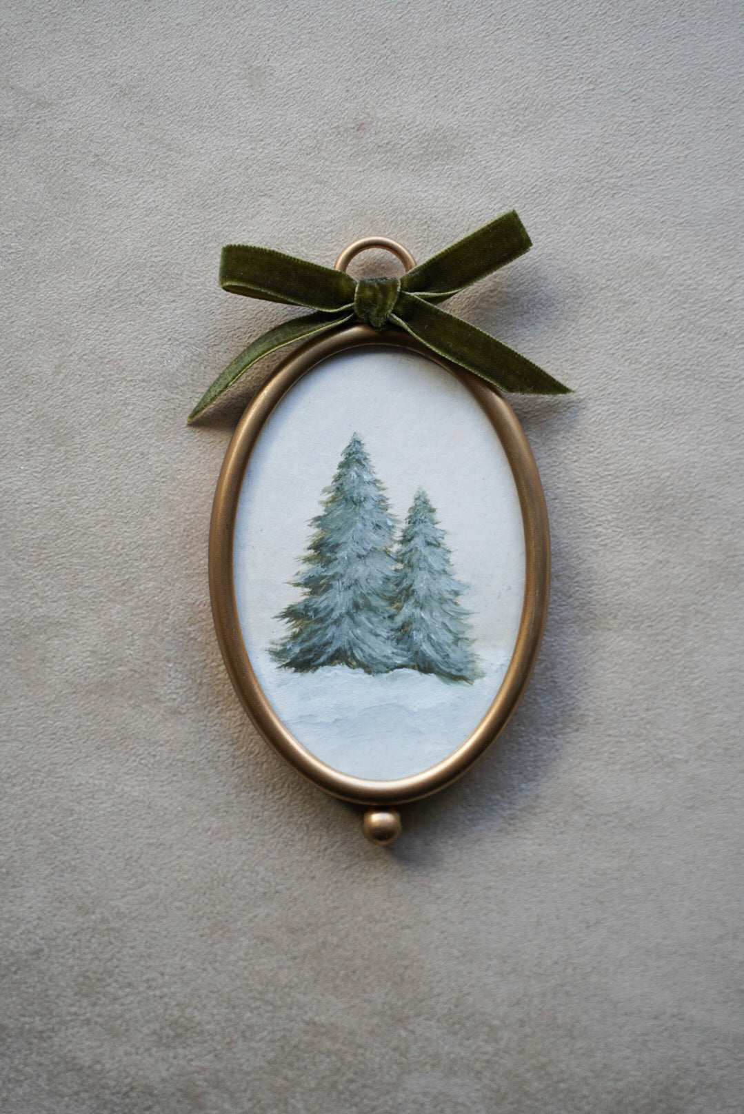 This delicate hand-painted winter scene captures the serene beauty of a snow-covered evergreen tree. Created with fine oil paints on a paper, this miniature artwork brings a touch of calm and nature’s charm to any space.